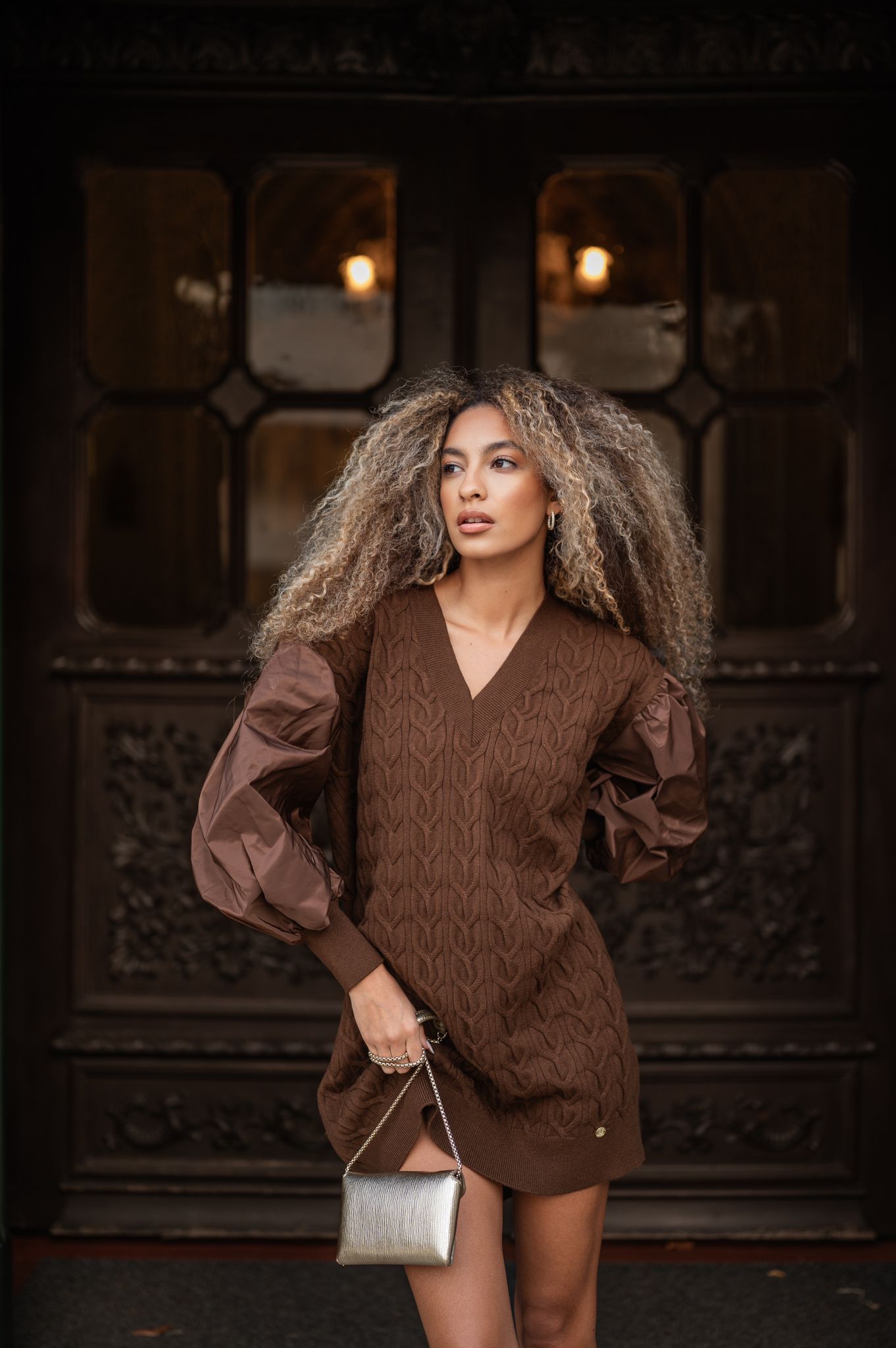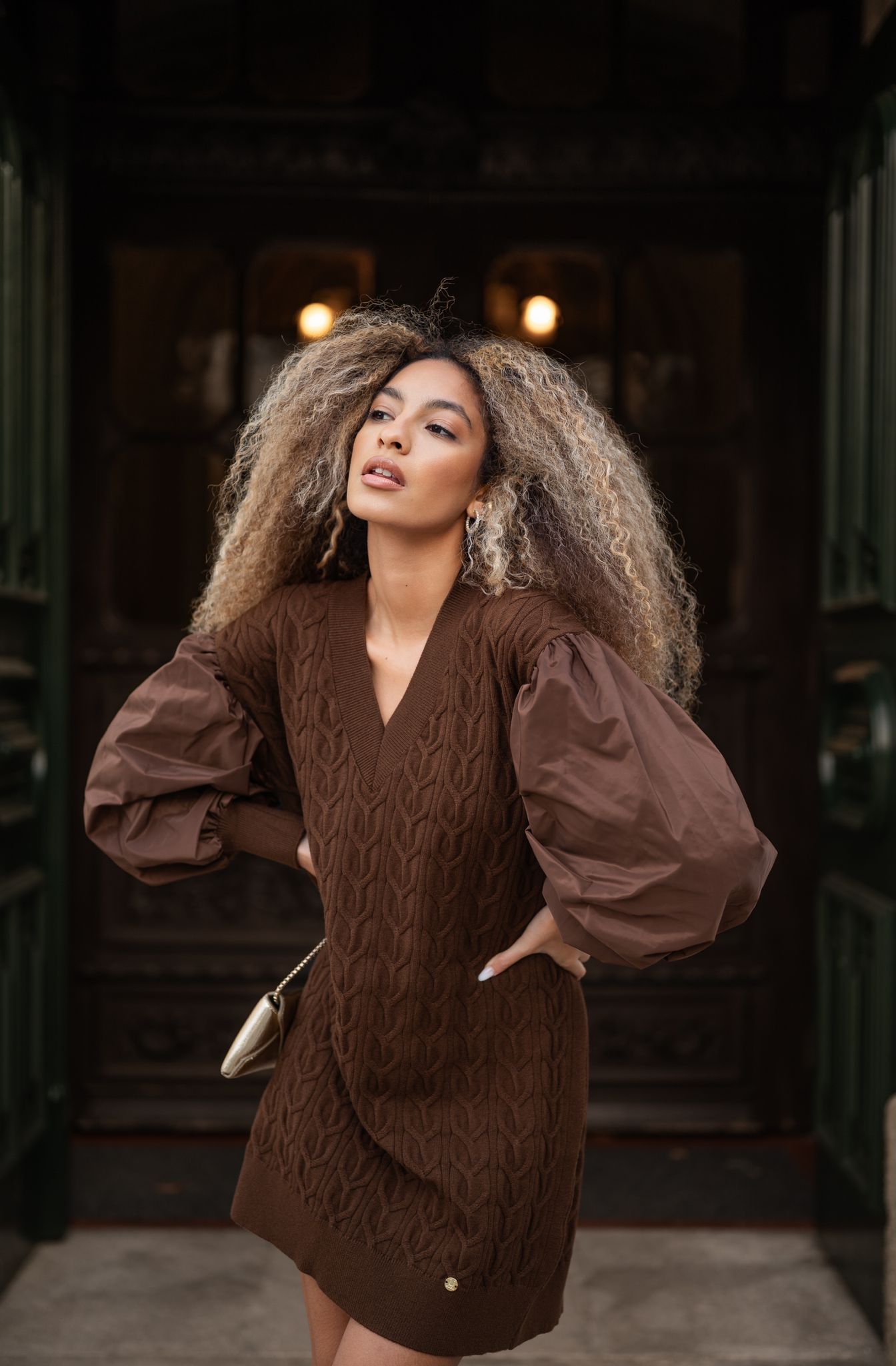 vestido em malha com decote em bico e cinto ajustável (também em malha). Racha lateral discreta.